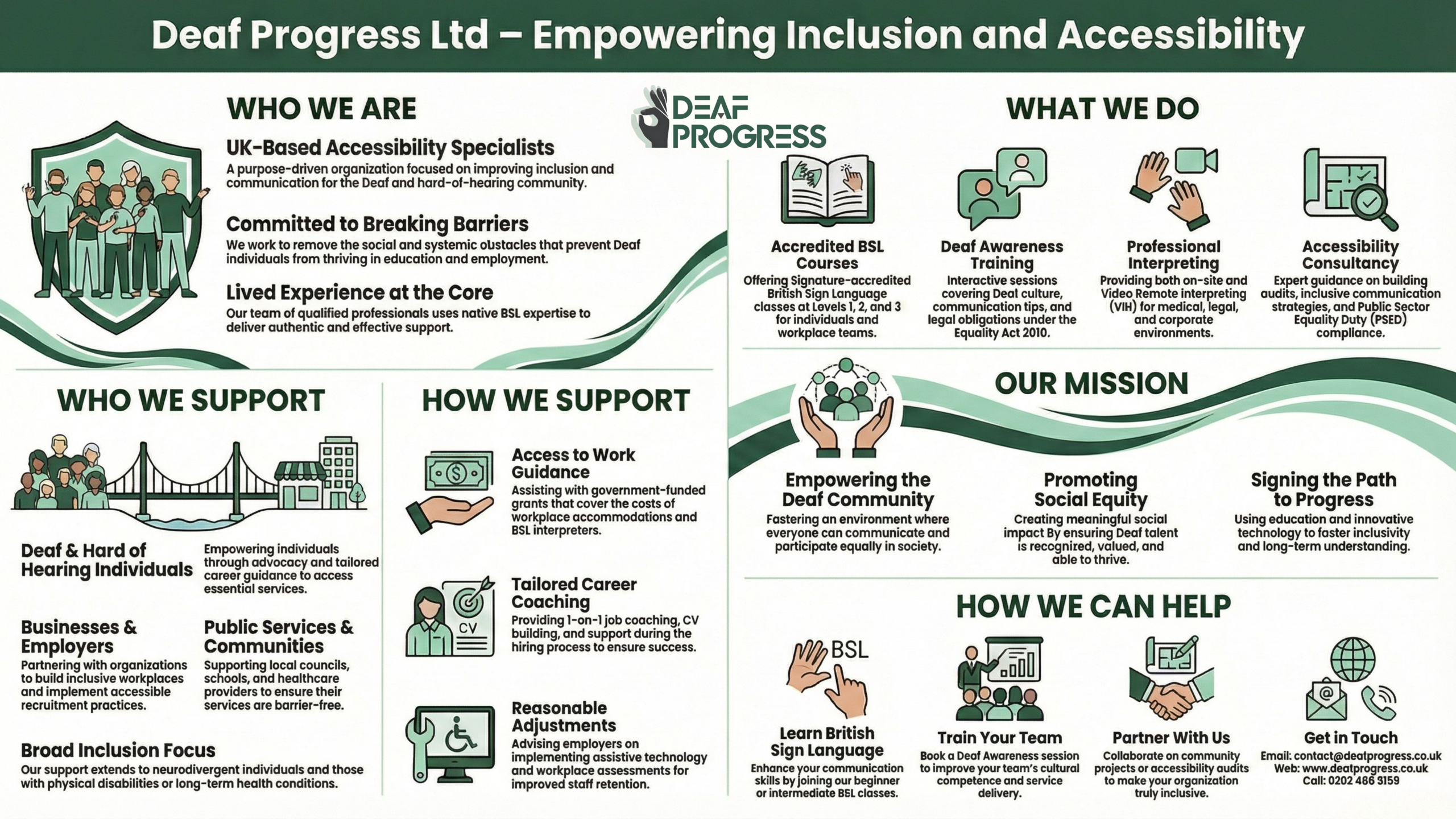Deaf Progress: Advancing Accessibility & Inclusion for the Deaf Community Stand Number: 6241 Accessible Travel Aids for Children Assistive Devices Assistive Technology Associations, Institutions, Organisations Barrier Free Living Communications Daily Living Aids Digital Accessibility Education, coaching and training Government Inclusive Employment Services Mobility Aids and Solutions Recruitment Platform Speech and Language Therapy Travel Accessible Banking Services Workplace Visual-Brochure-Dubai-Expo-scaled.png Phone: +447342820702 Address: Shoreditch Exchange, Oneder, Senna Building, Gorsuch PL E2 8JF, Greater London, United Kingdom E2 8JF Website: www.deafprogress.co.uk