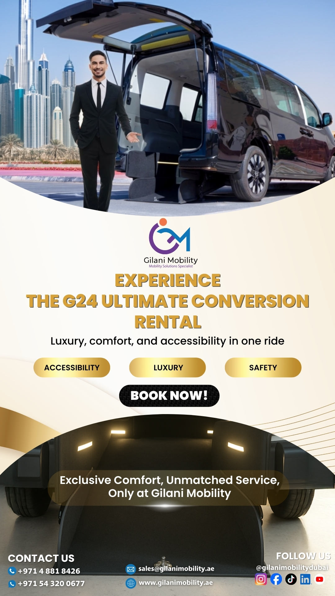 Gilani Mobility is an international company renowned for delivering high-quality and affordable mobility solutions and assistive technology, including advanced vehicle modifications and conversions. From our base in Dubai, United Arab Emirates, we are proud to serve the Middle East region, enhancing freedom, independence, and quality of life through our innovative products.